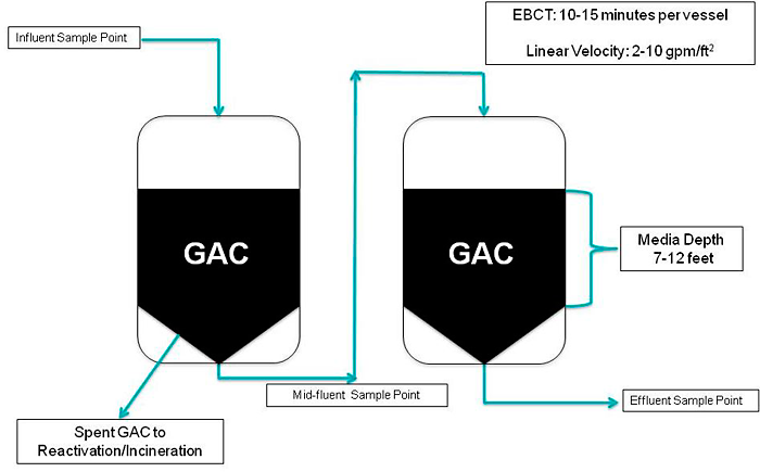 As illustrated in both diagrams below (Fig. 1 and Fig. 2), GAC and IX technology have a similar methodology, which involves running the contaminated water through a series of filtration units that remove the PFAS. In GAC systems, water flows through a bed of activated carbon where contaminants are adsorbed, while in IX systems, water passes through resin beads that facilitate the ion exchange. For some sites, it may be effective to utilize both ion exchange and GAC techniques in tandem to maximize PFAS removal efficiency.
